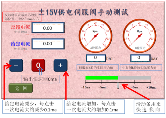 6、伺服閥正常時的表現(xiàn)為:a、給定電流0ma時,反饋電流在0ma,伺服閥輸出的A、B腔壓力相同;b、用滑動條可迅速換向,反饋電流改變且A、B腔壓力差較大;c、點擊增加按鈕,反饋電流逐漸增加且A、B腔壓力差逐漸增大;d、點擊減少按鈕,反饋電流逐漸減少且A、B腔壓力差逐漸減少,過0ma后伺服閥會換向;